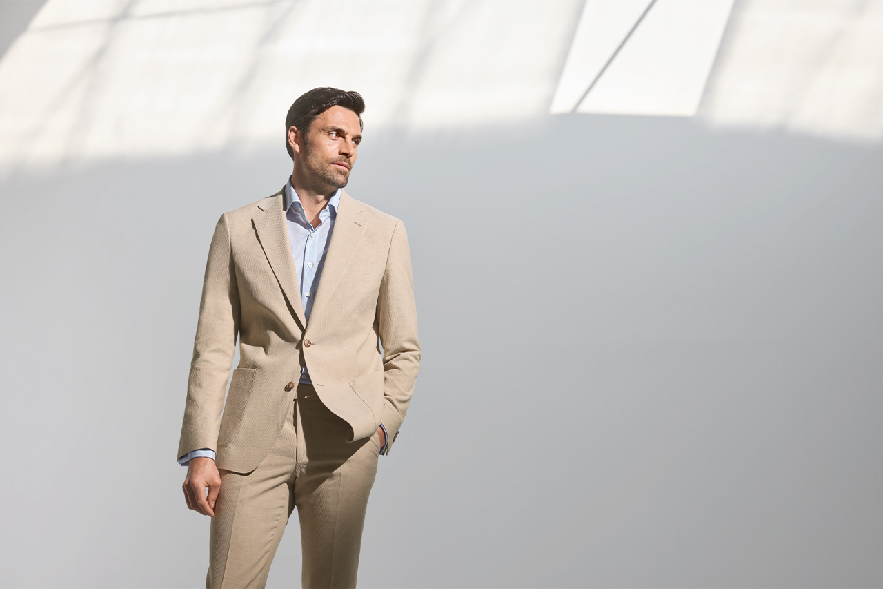 Für den Businessanzug empfehlen sich pflegeleichte, reisetaugliche Stoffqualitäten aus 100% Schurwolle mit einem Gewicht von ca. 280 Gramm mit einer Klassifizierung von SUPER 100 bis SUPER 120 und optimalerweise Freskobindung (Leinwandbindung) in uni Dunkelblau, Anthrazit und Schwarz. Dessins wie Nadelstreifen. Glencheck oder Pinpoint sind die Klassiker unter den Businessanzügen.
